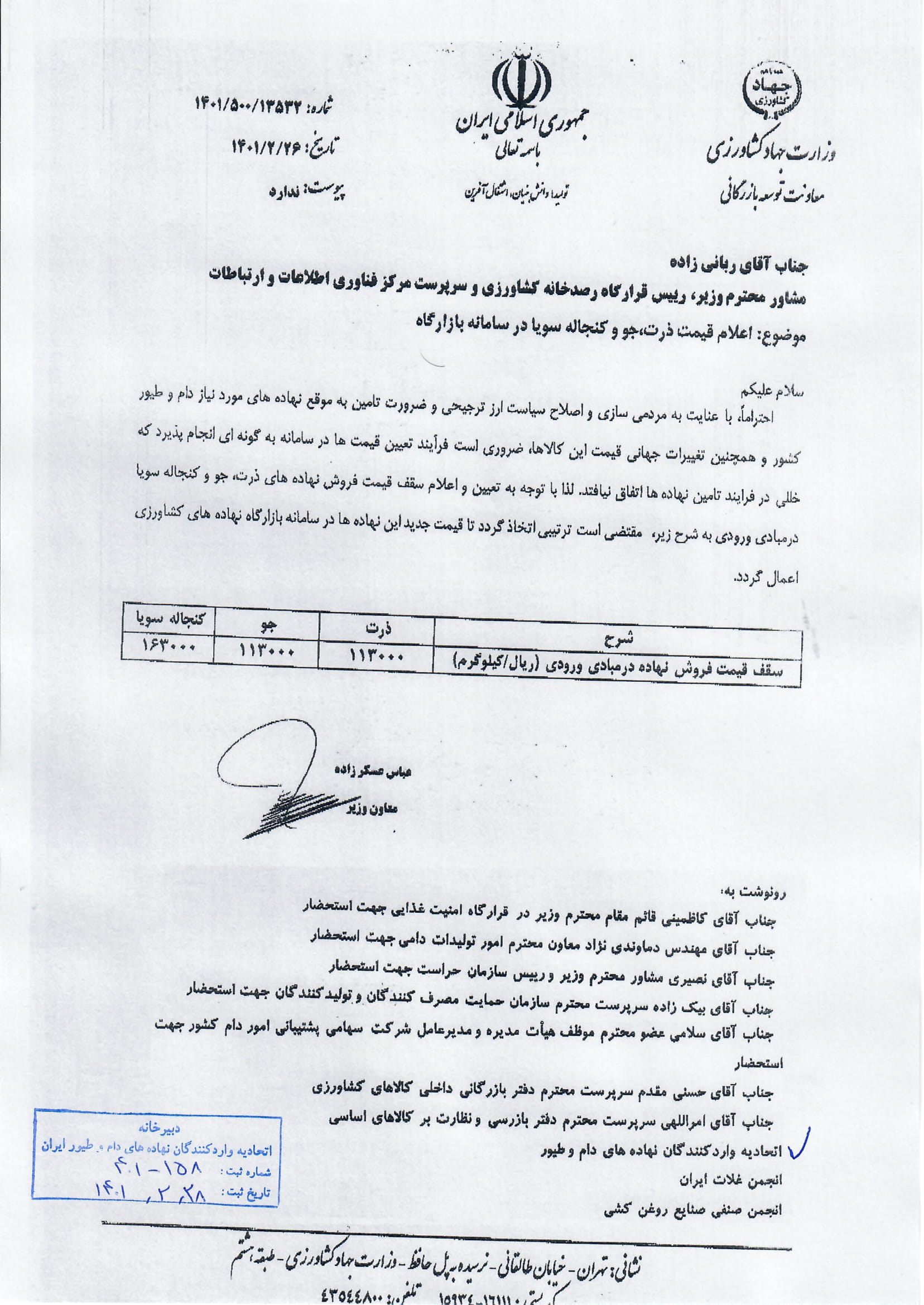 قیمت مصوب نهاده های دامی دسته: اخبار 29 تیر 1401 قیمت مصوب داخلی نهاده های دامی در سال های گذشته تاریخ اجرا ذرت(ریال) جو(ریال) کنجاله سویا(ریال) 1401/02/26 113000 113000 163000 1400/02/08 19000 18000 34000 1399/09/01 17000 17000 32200 1399/04/01 15000 15000 24500 1399/01/25 15000 13500 24500 1398/04/31 13500 13500 24500 1397/10/19 13500 13500 24500